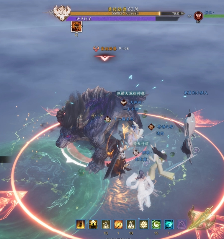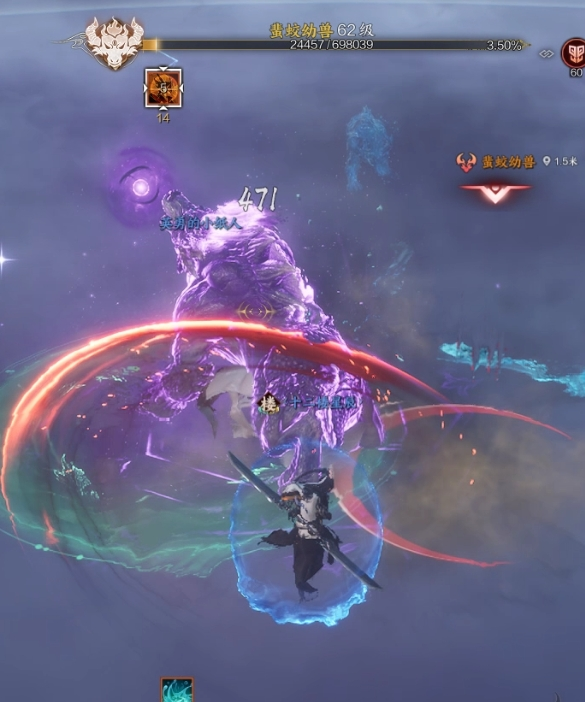 3.BOSS技能凶戾缠绕,点名一名玩家释放持续掉血DEBUFF,并且玩家周围生成一个紫圈,注意其他玩家不要靠近。