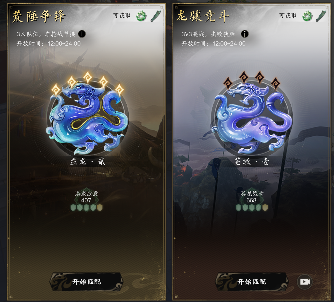 竞技模式即排位模式,目前有【荒陲争锋】和【龙骧竟斗】两种玩法