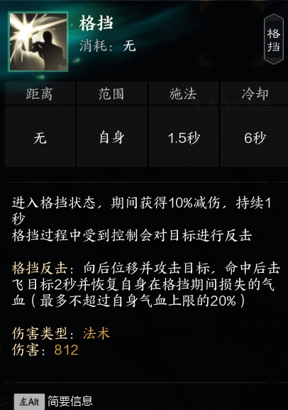 格挡技能是一个可移动读条1秒的防御技能,期间只有吃到控制效果才会进行反击并在反击造成击飞后回血,反击的动作可以被shift闪避打断,所以要小心敌方骗格挡(如你释放控制技能被对面格挡后以为对面会反击也马上格挡,但实际上反击被对面闪避打断了就是被骗了,导致没了格挡被敌方控住)