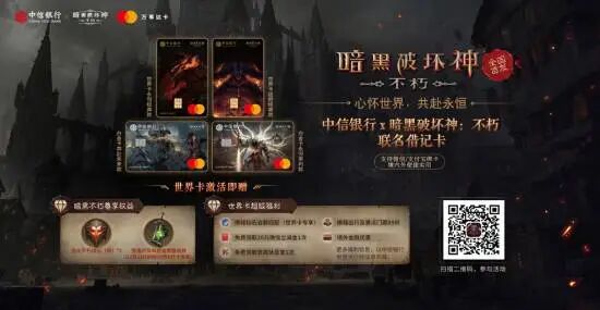 永恒超燃,尊享权益!《暗黑破坏神:不朽》×中信银行联名,中信银行和万事达全国首家发布的双币借记卡现已正式开启办理。11月11日前预约过世界卡的玩家,即日起前往指定网点即可开卡并激活。今日8:30-23:59开卡并激活暗黑联名世界卡的持卡人还有机会参加抽奖活动,抽取《魔兽世界》联动双形态传奇时装【背叛者之罪】(限50份),化身伊利丹!而未参加预约的玩家,于今日8:30-23:59办理并激活暗黑联名白金卡,同样可以参与抽奖,抽取《魔兽世界》联动典藏版灰烬使者武器皮肤(限50份)。其他日期开卡并激活联名卡的持卡人,则会获得一次抽取十连强化不朽钥石(限500份)的机会。