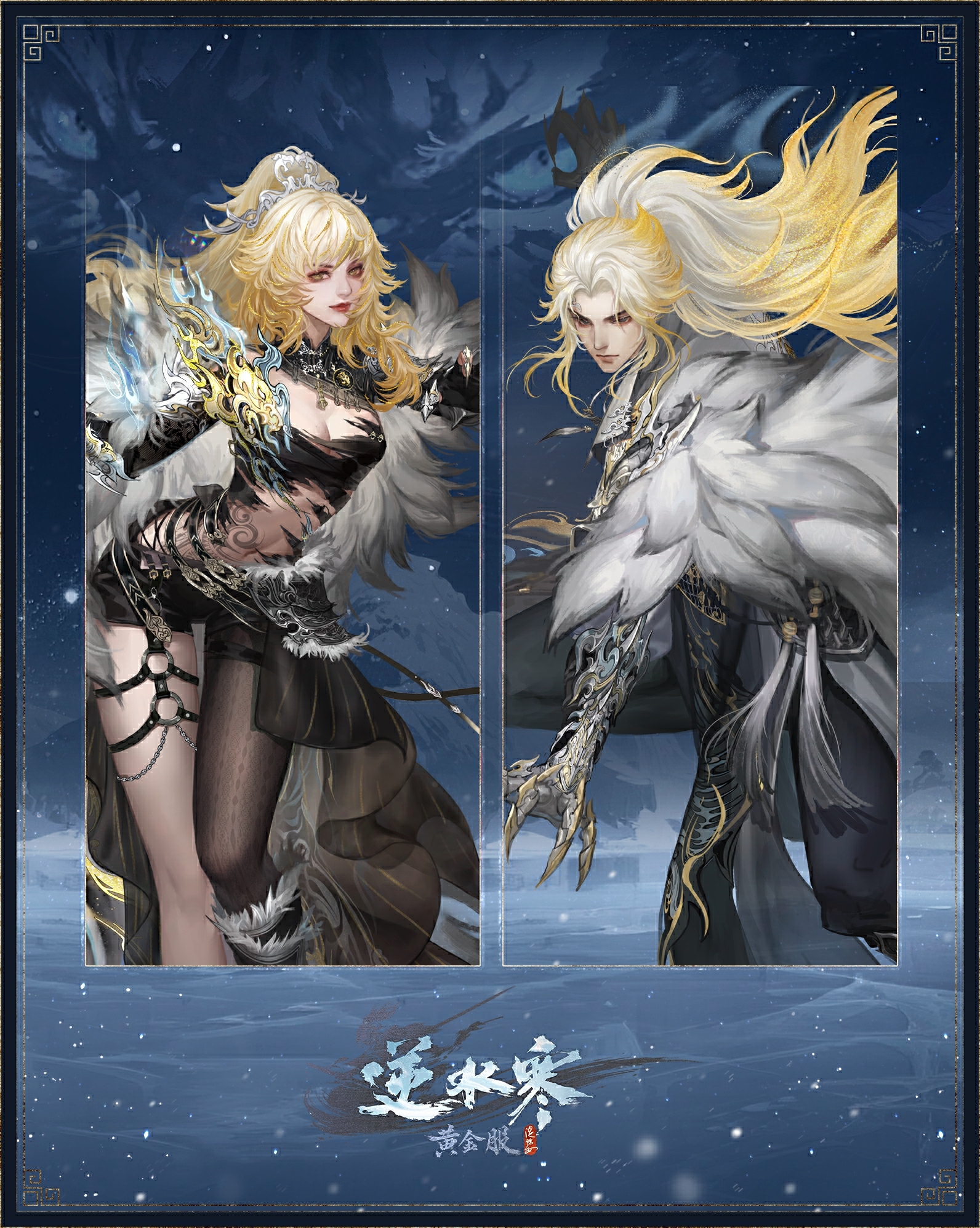 男装以墨黑为底,完美衬托出挺拔身姿。胸口的金色纹路似有神力流淌,肩头的虎皮披风尽显霸气。