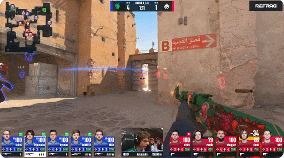 图二Inferno,蒙古队一上来就给对手当头一棒5-0开局,910、EZ哥联手发威,MGLZ半场进攻豪取8分。换边画风骤变,Grim、kvem和JT火力全开,PUA打出一波9-3进攻狂潮扳回一城。