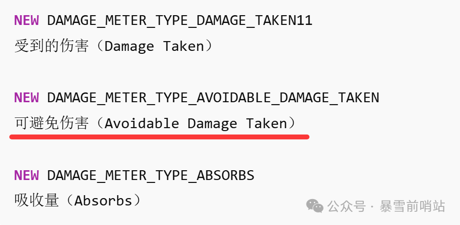 根据数据挖掘,伤害统计插件会新增一个功能:可避免伤害,也就是该躲不躲的伤害,这个功能在正式服一直也是一个比较有用的功能,治疗可以赛后复盘看一下这把到底是谁在吃伤害