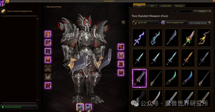 尽管至暗之夜测试服尚未重新启用幻化功能,但数据挖掘已发现,狂暴战将拥有一项专属能力 —— 可将双手武器幻化为单手武器外观!显示双手武器幻化为单手武器外观的幻化界面