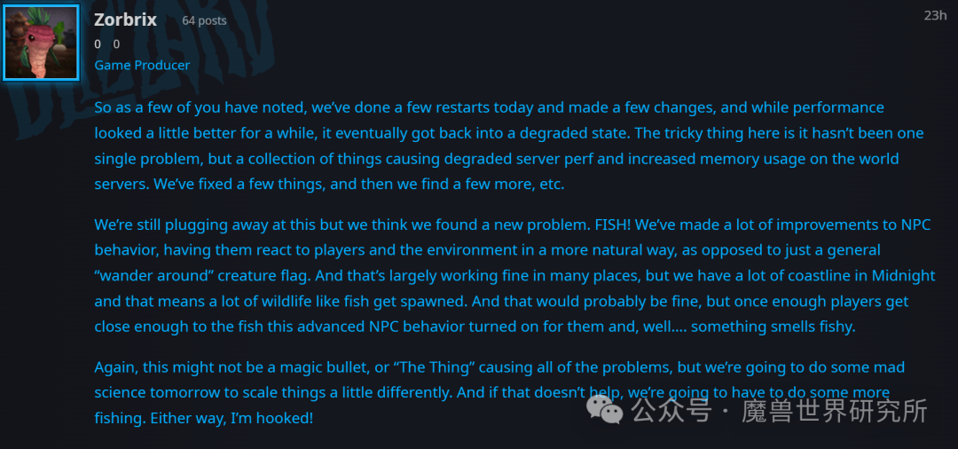 暴雪蓝贴揭秘:《魔兽世界》鱼类NPC行为逻辑导致服务器崩溃!BUG越修越多,至暗之夜测试服卡顿问题持续恶化。点击查看官方最新修复进展!