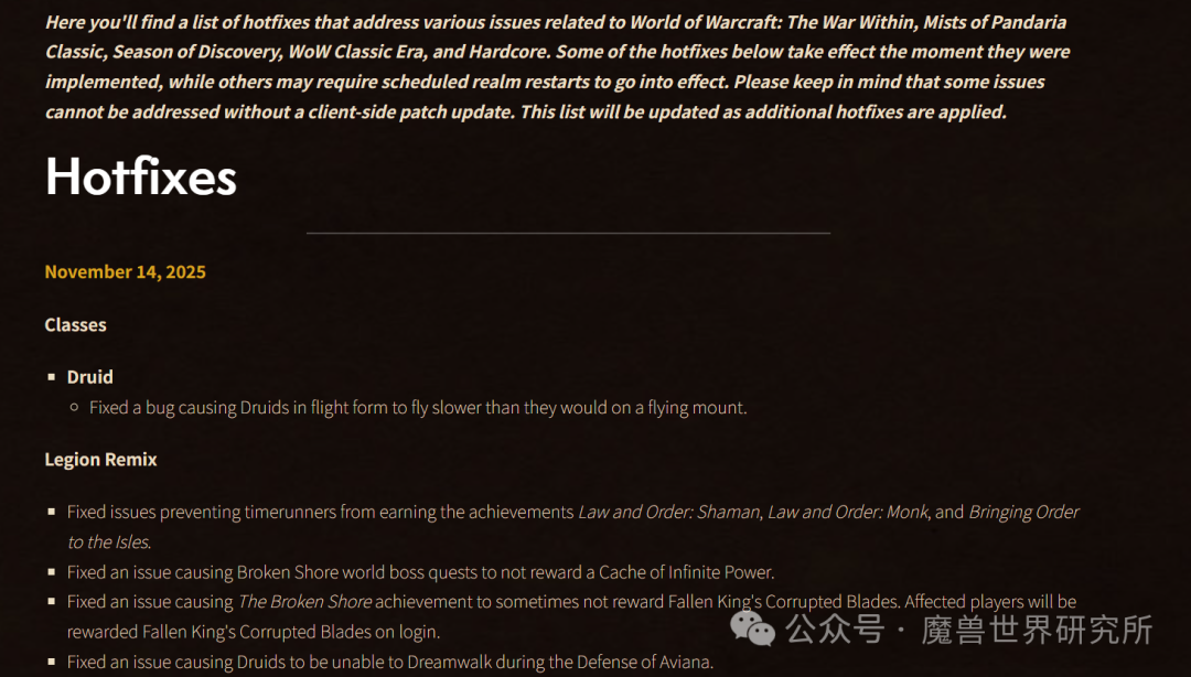 11月15日魔兽世界热修:解锁更多隐藏神器外观,修复德鲁伊、恶魔猎手等职业问题,提升时空奔行者体验!立即查看详情。