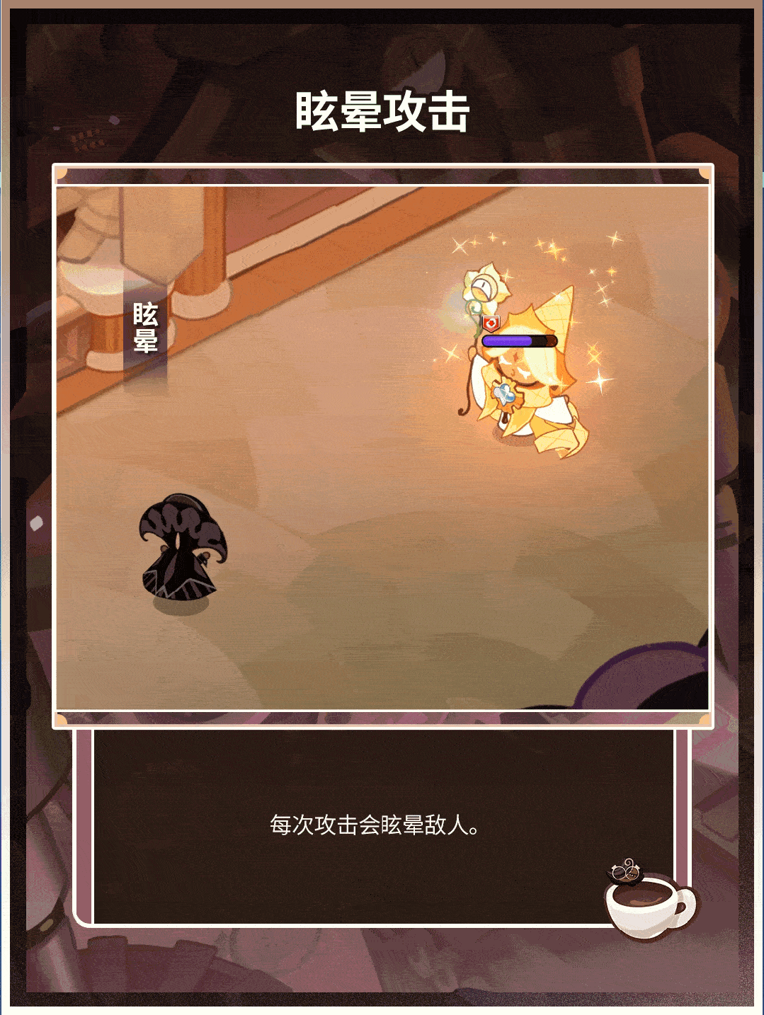 解锁魔法糖后,浓缩咖啡饼干每次释放技能都会眩晕敌人,并且最后一击施加负伤效果。当浓缩咖啡饼干魔法糖等级达到10级后,将提升最后一击当伤害,并造成眩晕效果。