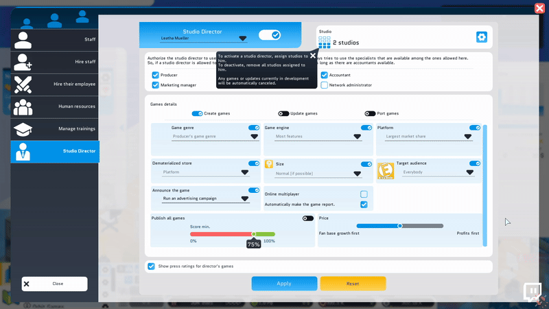 工作室总监,或者说至少是它的配置界面,已经进行了全面改进,让你能够更好地控制。你现在可以明确告诉工作室总监只制作游戏,或只制作更新,甚至只制作游戏移植版。或者你可以告诉它做所有事情!最棒的是,界面会根据你的指令动态更新。就是这样,我认为工作室总监现在是《城市游戏工作室》最出色的功能之一了。
