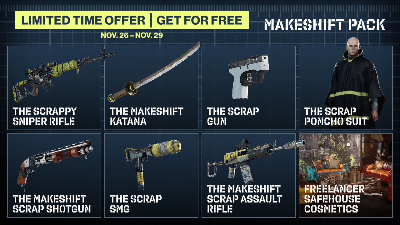 《HITMAN暗杀世界》限时免费领取临时装备包!包含废料斗篷套装、武士刀、手枪等强力武器,截止11月29日,立即解锁别错过!