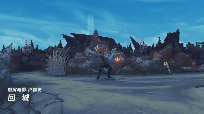 卢锡安手持幽魂双枪,一艘残破的船只从幽暗的海水中浮起并停于他的脚下,卢锡安举枪击碎亡魂,随即回城。