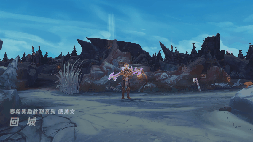 德莱文身披华丽的肩甲,手握紫金色利斧,让利斧在掌间行云流水般回旋飞舞,随即自信回城。