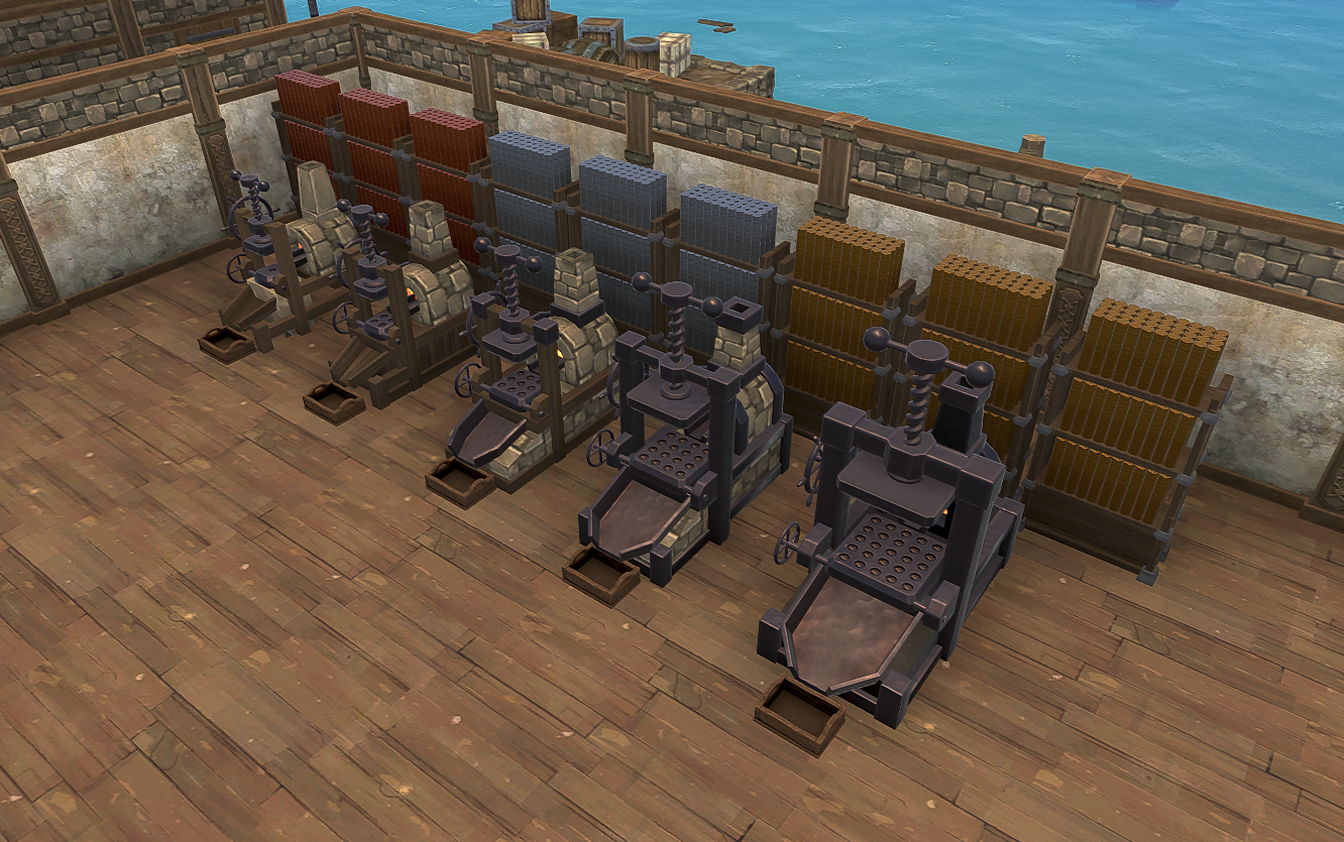 五台铸币机根据投入的锭材产出不同数量的杜卡特,新货架为工坊提供了专用存储空间。