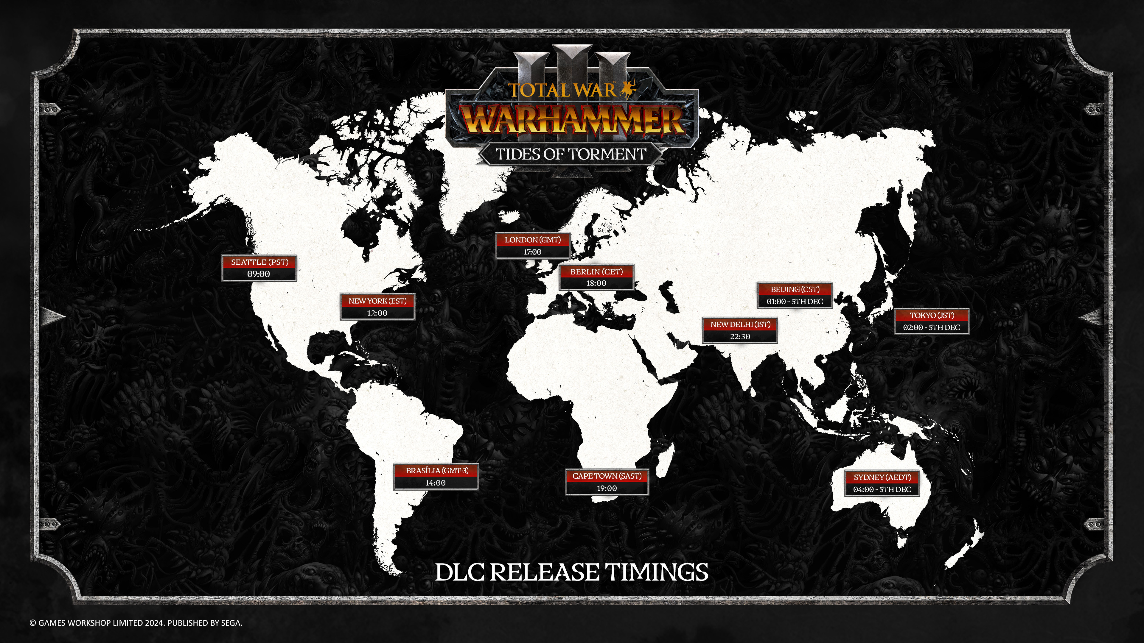 《全面战争:战锤3》苦痛浪潮DLC发布时间公布!12月4日格林尼治标准时间17:00上线,查看地图了解本地发布时间。获取最新消息,别错过更新!