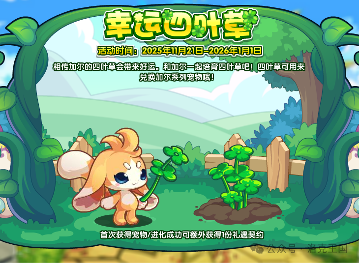 加尔系列宠物也将在本周回归,和加尔一起培育四叶草吧!四叶草可用来兑换加尔系列宠物及其后续进化资格哟!喜欢它的小洛克千万不要错过。