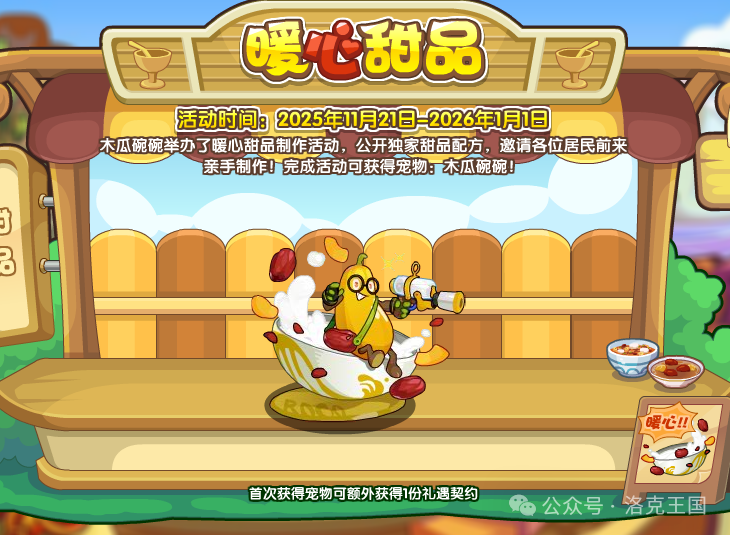 木瓜碗碗举办了暖心甜品制作活动,公开独家甜品秘方,邀请各位居民前来亲手制作!完成活动可获得宠物:木瓜碗碗!
