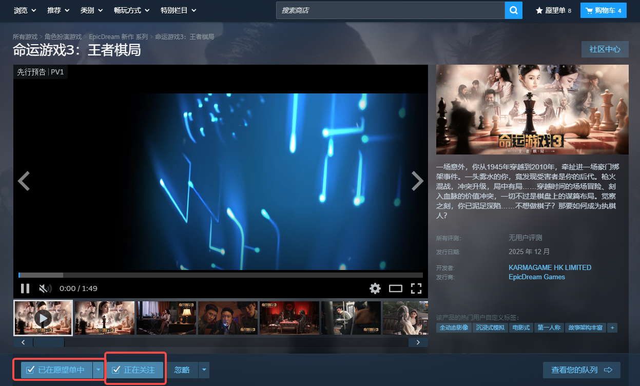 (2) Steam搜索命运游戏3:王者棋局,或通过链接进入商店页面,点击【添加至您的愿望单】并【关注】