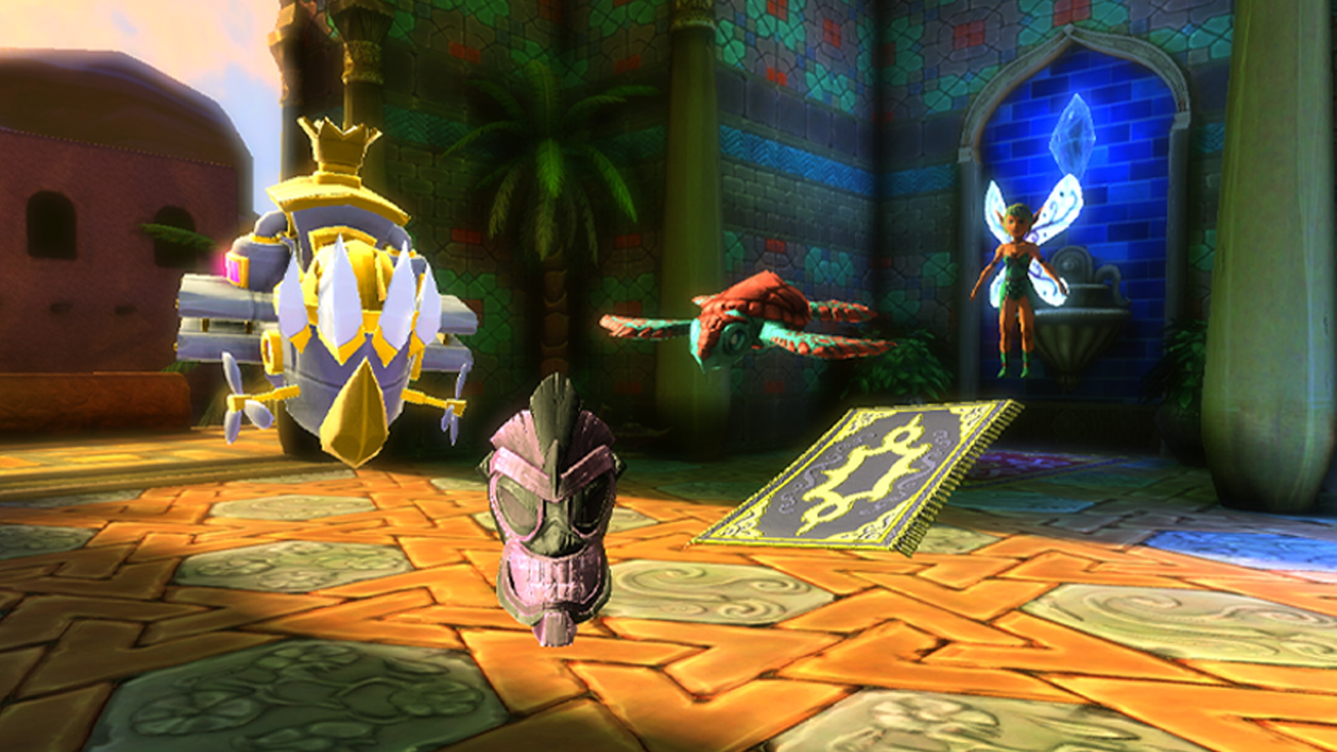 迷雾沼泽森林的勇敢仙子凯莉、莫拉戈沙漠镇的魔法地毯、阿夸诺斯的海龟、天空之城的小巡洋舰和阿卡提提丛林的图腾面具。