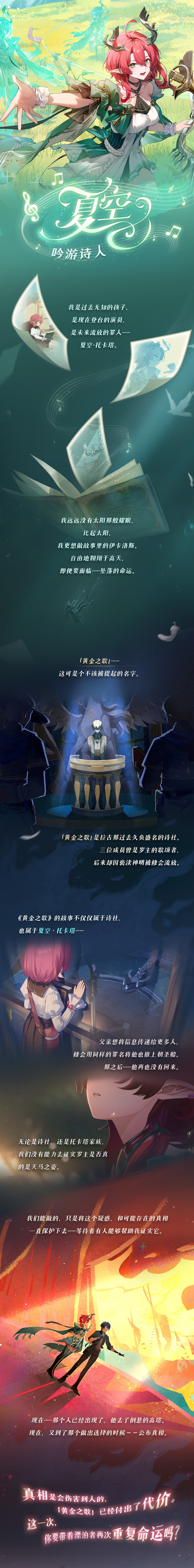 黎那汐塔的吟游诗人——夏空。她为神明而歌,也为平凡的人类而歌。她于旅途中记录着故事,传唱着故事,与故事的主人,故事的观众一同欢笑、感动、流泪。