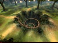 游戏画面1为一矿坑,从画面上可以看见周围平原的树,与树林中薄薄的雾,以及林中小道。经过美工人员的精心处理,充分显示出了场景中的幽静与神秘;阳光洒落,班驳树影清晰可见;地面的草地和青苔也清晰可见,颜色层次丰富;最细腻的莫过于图片中央的矿坑螺旋梯,整体立体效果显著,结构细腻;