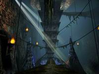 游戏画面2为一古堡,经过特殊处理的光束可以称得上是《*****》的特色之一,周围的暗淡效果也是经过特殊的雾化处理。当然,这些都不能算最重要的,古堡的外墙,以及绳索上的苔藓,看得出全部是精心绘画所成。背景墙壁上的壁画也清晰可见,墙上的壁火,栩栩如生;下面的湖水,泛着折射的幽蓝的光,映照着周围的山壁,似乎说明有什么秘密暗藏于其中。欣赏这些图片,有身临其境的感觉;