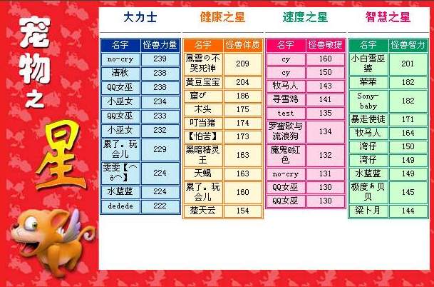 这里特别恭喜no-cry、�L��の不哭死神、cy和小白雪巫婆 !这4位玩家将得到18888兽币的特别奖金!宠物之星,三星一士,还在继续举办中,你会成为人人景仰的健康之星、大力士、智慧之星和速度之星吗?我们期待杰出玩家的出现,我们等待你的参与!