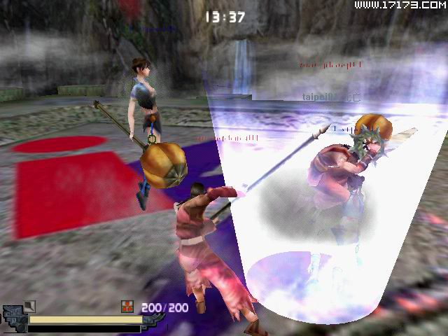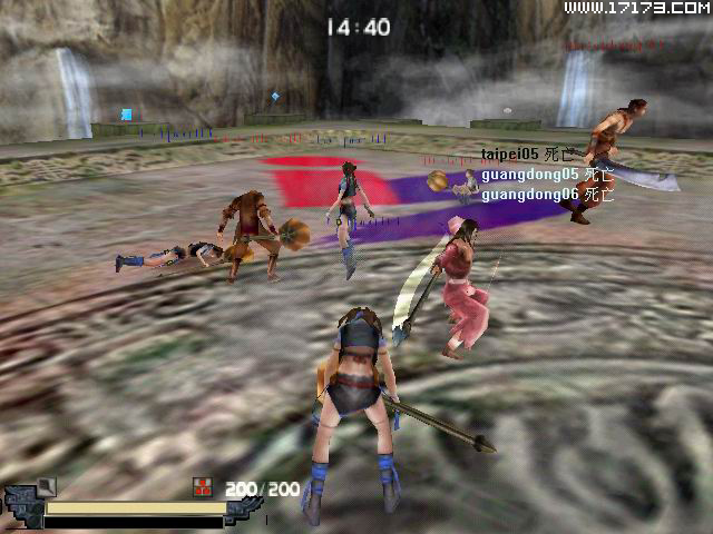 马上到了第二局,台北“梦幻队”发挥他们特有的默契,在攻击防御中加上大槌暗器的配合之下,在整局时间的三分之一不到就先挂了广东“蛙网队”的一名成员,继卜派兄之后,梦幻风儿也尽力在整场比赛中努力施展其飞镖神射,不过可能是过于紧张所以显得有那么一点不准,还是让广东“蛙网队”放出了重槌大绝,但即使如此他们依然不顾自己稍处劣势,努力夺得胜利,最后还是由台北“梦幻队”取得第二场胜利。