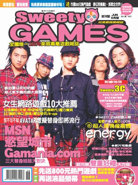 Energy继成为游戏代言团体后,6月15日再登上中国**第一本专属女生电玩杂志「Sweety GAMES」试刊号封面人物。为增加杂志的可看性与娱乐性,未来每期「Sweety GAMES玩美眉」都将请到偶像帅哥来为这本专为女性玩家设计的杂志担任封面人物。