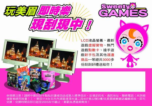 「Sweety GAMES玩美眉娱乐杂志」表示,为回馈读者,将举行试刊好礼双重赠-即刮即拿大方活动总计共有3500项刮刮乐奖品包括了LCD与目前最受玩家瞩目的热门游戏周边商品,此外并随书附赠市价高达800元梦幻西餐厅2-挑战全世界游戏软件。