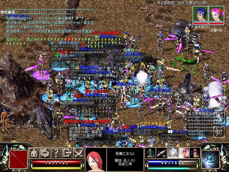 6月18日晚6时50分,一句系统的提示打破了我沉闷的练级,正当我收拾行装回城补充弹药准备杀到沙漠城堡的时候,只见药店人山人海。于是我最快速度的补充好了弹药,用我拿手的瞬移飞到沙漠商店的时候,只听见我的机子呱呱作响,我还以为我的机子出问题了,仔细一看,原来沙漠城堡早已经是人满为患,都在等待着怪物的降临。7时正,突然在等待的人群中出了两只恶魔战士。哎,老魔兄,你哪里不出,偏偏出现在人群中,刹那间,只见刀光剑影。凶狠狂雷从天而降,那呼啸的子弹正穿透着敌人的身体!那鲜红的血染红了大地,看着是那样的显眼。昔日,恶魔战士那横扫千军如席卷的气势已荡然无存。反而在百级勇士们面前是显得的那么的脆弱,不到10秒中,老魔便消失在了人群中。于是,玩家们的情绪终于高涨起来,不停的四出找怪,突然,我只看到一道电光划过,武神出来了。仔细一看,无语,原来是一只坦克卫兵,我鼠标都还没来得及放在他身上,就再也没机会了。哎,乱世无常的兄弟伙些真猛啊!在一段焦急的等待之后,只看见一个怪摸样,长慢了脚的东西向人群冲来,仔细一看,原来是鱼妈妈啊,这次我有机会了,一个瞬移飞去,只管狂电,我想哈哈有机会检点东西了!不到5秒,我的鼠标上没了巨型污染鱼五个大字,我兴奋的Ctrl+E哎,衰啊,什么都没,忍了。继续等。等了好久,再也不见那刺激的场面。玩家们纷纷喊出了自己的心声,“我要武神”“我要虎王”“强烈要求把虎王放出来”玩家们不停的发表自己的意见,可始终再也不见怪怪们的身影。(说实话,我也觉的怪太少了,两个恶魔,一个坦克卫兵,5个大鱼就什么都没了,希望GM下次多放点出来,不要让玩家们失望,呵呵,至少要看到我们可爱的虎王老兄啊)。