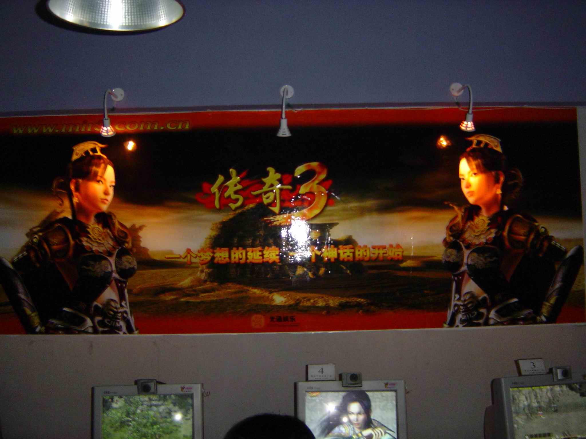 金锋网吧的柜台前,《传奇3》地贴上,一切“交易”都在玛法大陆上完成。