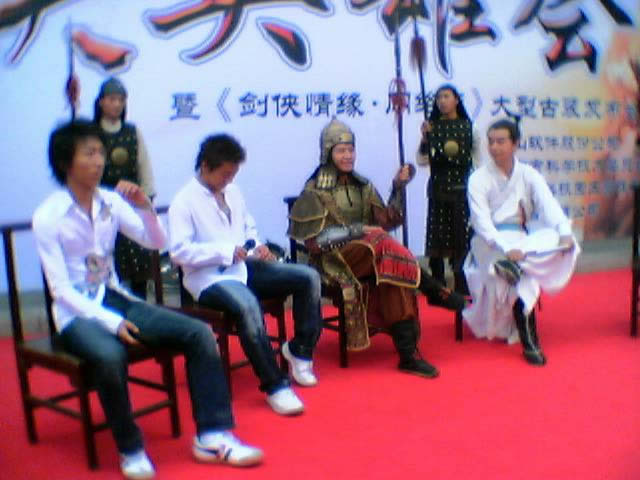 7月26日,周六的傍晚,一抹晚霞映照着央视外景基地的古建筑群,仿制东汉风情的铜雀台景区热闹非常,铜雀台上下武士林立,“少林、武当、峨嵋…….各大武林门派弟子”齐聚一堂!俨然是一部武侠大片的拍摄现场。其实这是金山中华武侠网络游戏大片――《剑侠情缘网络版》的发布会现场。大会按照古代武林豪侠聚会的形式设计,号称“剑侠英雄会”,上千嘉宾分列于“少林、武当、峨嵋、丐帮、唐门等帮派”之中。三十余名执剑武士进行大型剑阵表演,陈妃平、“彝人制造”主唱阿木现场演绎游戏音乐《剑侠情》、《大英雄》;而著名组合羽泉在古装武士的簇拥下登场,一曲游戏主题曲《这一生只为你》把现场气氛推到了高潮。