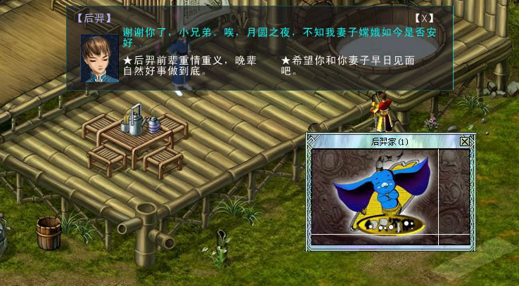 离开枉死城后来到后羿家,月圆之夜,后羿不由思念嫦娥,此时有两个不同的回复选项,选择不同,则有不同的情节发生。选择第二个回答,后羿为了感谢玩家帮助他脱离苦海,赠送一只一级的辫子熊给玩家作为谢礼,收到后就被送到水城。