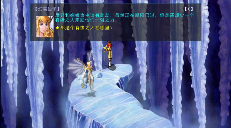 幻雪仙子给玩家一枚雪灵丹,带着此丹找幻雪仙子就可以到达月宫外,见到嫦娥了。若是玩家要帮助嫦娥与后羿相见,则要损失400级的等级。如果不帮助他们或是等级不足,则可以得到一个蟠桃月饼。