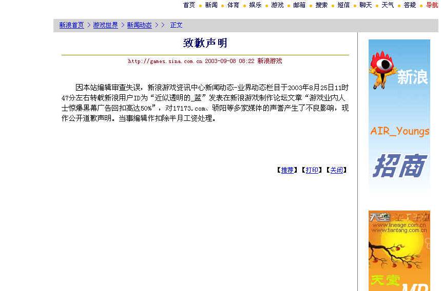 因本站编辑审查失误,新浪游戏资讯中心新闻动态-业界动态栏目于2003年8月25日11时47分左右转载新浪用户ID为“近似透明的_蓝”发表在新浪游戏制作论坛文章“游戏业内人士惊爆黑幕广告回扣高达50%”,对17173.com、骄阳等多家媒体的声誉产生了不良影响,现作公开道歉声明。当事编辑作扣除半月工资处理。