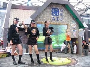 为了更好地展示出这些周边产品的精彩,我们特地聘请了专业模特现场演示。全身装备好CS真皮背包、钱包、帽子、Tshirt的三位模特每次登台,都会吸引大批游客驻足观赏摄影留念。三天来更有众多铁杆CSer不断前来询问是否能够现场购买这些精品。