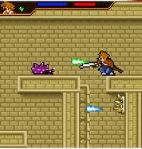 数字键“2”“4”“6” 代表上、左、右移动方向。“8”是下蹲。“7”“9”键可以实现跳跃功能。“5”是攻击。与左右键配合,实现向左上方跳和向右上方跳跃。与下面的场景连接操作的先下蹲再跳跃,此操作在游戏过程中会提示。