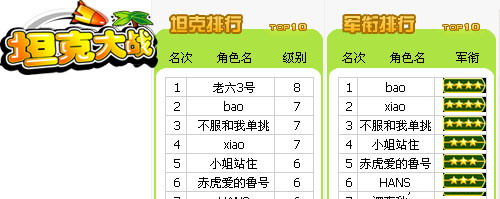 “**排行榜”是根据玩家的**的级别排名的。每个玩家刚进入坦克大战的时候,都是列兵**。随着在战斗中取得胜利,**也会一步步提高。取得的胜利越多,**也升的越快,所以**是玩家荣耀的象征。当**升级成为少尉后,就可以组建自己的坦克军团了。