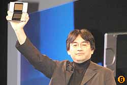任天堂社长岩田聪高举NINTENDO DS的实体向到场的观众展示,信心满满的向世人揭示“游戏的未来”。