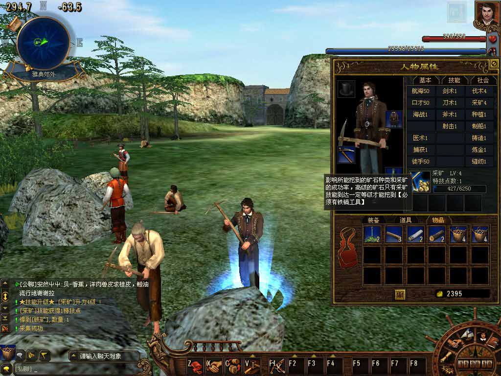 采矿:影响所能挖到的矿石种类和采矿的成功率,高级矿石只有采矿技能达到一定的级别才能挖到(采矿需装备铁镐工具),在郊外采矿可增加采矿经验以提升采矿的等级.暂未开放采矿特技.