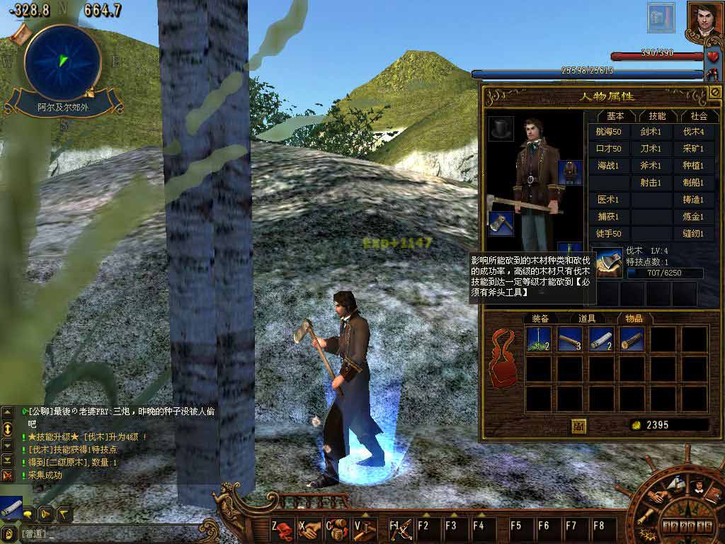 伐木: 影响所能砍到的木材种类和砍伐的成功率,高级木材只有伐木技能达到一定的级别才能砍到(伐木需装备斧头工具),在郊外伐木可增加伐木经验以提升伐木的等级.暂未开放伐木特技.