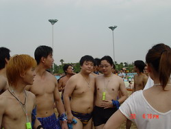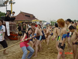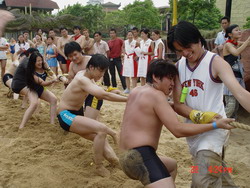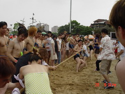 一般玩家都听过沙滩排球比赛,沙滩拔河比赛对玩家而言确实非常新鲜!8月28日16点20分,久游网为参加活动的玩家带来沙滩拔河比赛,让众人过足了瘾。比赛正式开始,在主持人一声令下,五位美女来到舞台下与玩家共同体验沙滩拔河紧张、刺激的快感。五位美女分别以红色、黄色、蓝色、白色、粉蓝色五色头巾召唤队友,将相同颜色头巾的玩家集合到自己门下,每组八个男孩、二个女孩共十人,双方准备就绪后、在裁判一声令下,轰轰烈烈的沙滩拔河大赛正式上演了!