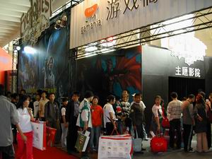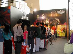 其中接待区内,是排队等待进入主题影院的玩家,阵型由最初的两排最后变成一字长蛇阵,由展台里蜿蜒到展台外,场面虽然热烈,但却由于工作人员的维持秩序,使得一切现场的工作都有条不紊,有序地顺利进行着。每场限定人数入场,是希望能给观众在影院里面舒适、安静的充分享受游戏画面带来的乐趣与震撼。