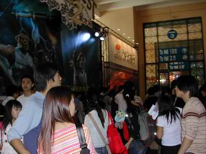 另外一处的展示区同时也负担了售卖、发放观影后纪念礼品的功能,三款不同包装的客户端和游戏点卡摆在长长的售卖台前,供玩家们挑选、购买。一样的人群涌动,更加证明了游戏的魅力。