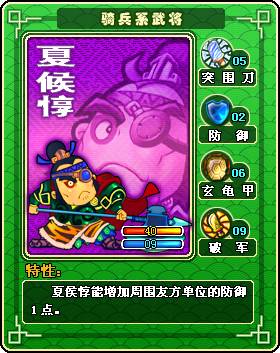 “名将录”中的夏侯惇又有何过人之处呢?虽然夏侯惇很“丑”也不“温柔”,但是和他同组的小兵却能得到无微不至的“关怀”哦!身处夏侯惇周围的友军,都能自动增加防御,而防御技能则可以提升夏侯惇自身的防御力,配合突围刀这个破阵杀敌之绝技,同时攻击多个敌人,威力十分强大哦。还有破军,这个曹魏大将才能掌握的强横刀法,能杀伤成片的敌人,攻击范围极广,危机时刻使用出来一定可以扭转战局!