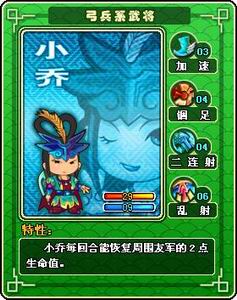 “名将录”中,小乔粉墨登场,倾国的美貌使在她周围友军每个回合都能自动回复一些生命值哦。而她本人也拥有众多绝技,加速可以提升反应和移动力;二连射能在短时间内连射两箭;锢足使用后,中箭者会移动困难,战力尽失,非常的霸道;而乱射,这个诸葛孔明所创的弩兵战术,能瞬间射出大量弓矢射杀敌阵,威力自然巨大!