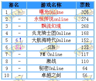 本期看中国**新网游排行榜TOP10除《SUN》与《大航海时代》交换了一下位置外,无其他变化。