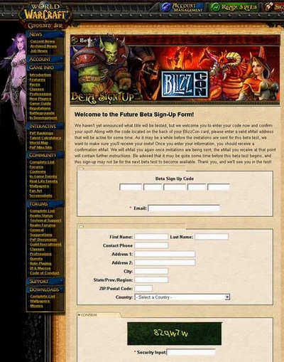 小编今天打开暴雪《魔兽世界》官方网站时惊喜的发现了这样的一个网页,暴雪开始征集“新游戏”Beta测试的玩家。该网页地址:http://www.worldofwarcraft.com/blizzcon/beta-signup.html