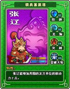 “名将录”中的张辽不仅自己拥有极高的骑术,还带动了同队士兵移动力的增高。突刺技能是西凉军团著名的突刺战术,能破敌于三丈之外;龙驹能提升骑兵的移动力和反应而防御则可提升自身的防御力;雷破天惊是张辽的绝技,以迅雷般的速度冲击敌阵,对没有防备的敌人百发百中。