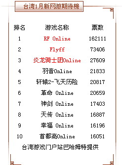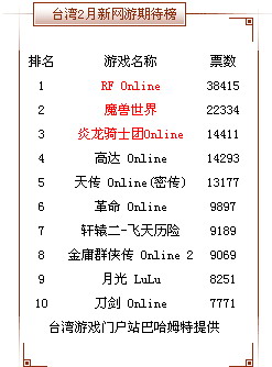 《 飞飞》因为正式运营,所以离开的期待榜。本月《 魔兽世界》新上榜,便取代了《飞飞》的亚军。魔兽的魅力太强大了,预计下月RF将要丢掉冠军位置。