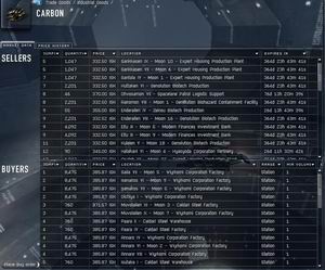 EVE的经济系统主要以市场(Market)平台,通过查询每样物品,可以看到以下信息:卖方(Sellers)、买方(Buyers)、物品数目(Quantity)、物品与游戏者当前距离(Jumps)、报价(Price)、具体地点(Location)、交易时限(Expires)。该模块适合大规模大范围的公开交易。主要通过订单(Order)完成。 所有EVE的可购商品都是由专门的空间站利用各种原料生产出来的, 游戏者自身的采矿、出售、原料运输、制造等活动构成了EVE经济系统的核心。游戏者可以通过一个统一的市场信息平台(Market) 随时、随地查询各种市场信息(商品价格、供货量、需求量、交易时限、买卖方信息、货物所在地、当前距离等等)。游戏者在可以在任何地点、任何时间购买、销售任何物品(当然前提是有足够的资金实力)――买卖双方无需知道对方任何信息,可即时完成所有交易。更令人惊讶的是,通过查询商品详细市场信息(Detail),可以观察出商品的每日交易量、每日平均价、5日价格均线、20日价格均线,以及唐奇安通道(Donchian Channel表明商品价格异动的指标)。某些游戏者在拥有某些特殊商业技能(比如对远程物品的买卖)并掌握了足够资金后,可以一动不动,仅仅通过精心分析市场信息,轻点鼠标,在短期内坐拥富可敌国的财富。 ――实际上,EVE的经济贸易系统已基本具备了股票市场交易的雏形,一夜暴富绝不是神话。
